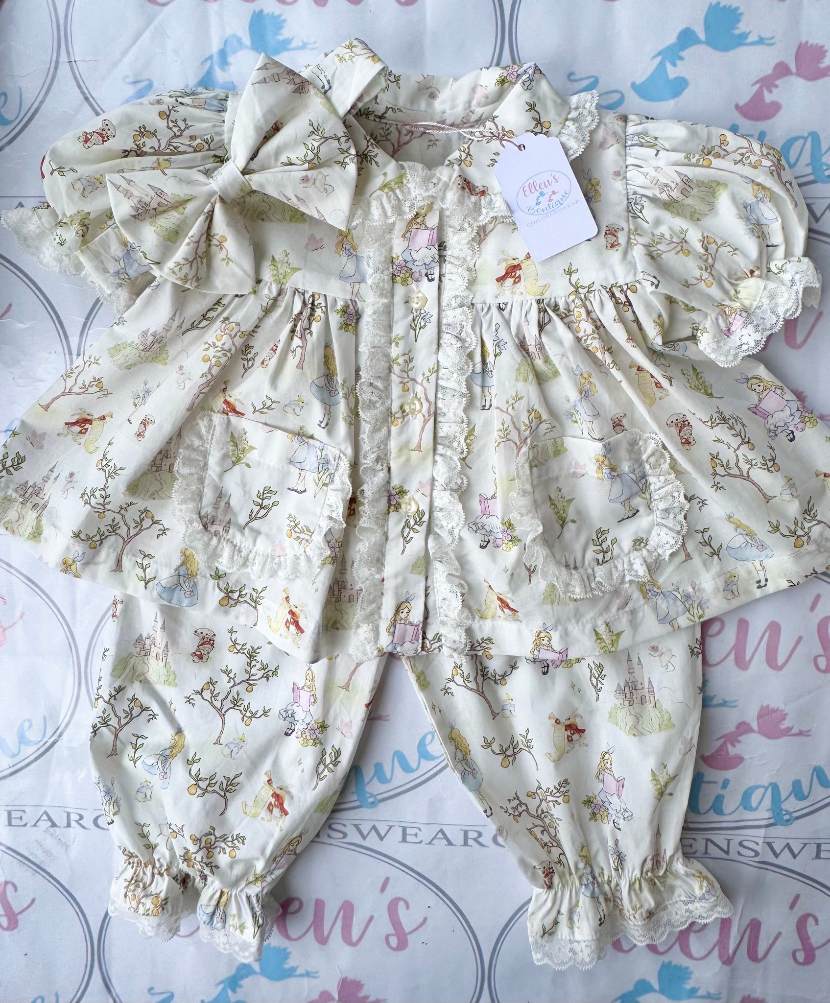 100% soft cotton Alice in Wonderland and lace pyjamas.This comes with 2 matching hair clips (3m and 6m comes with headband). Fitting is slightly generous