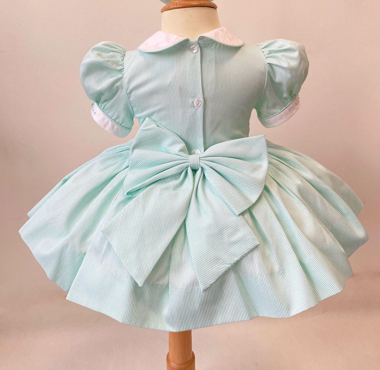 Mint stripe smocked dress with cream and pale pink smocking