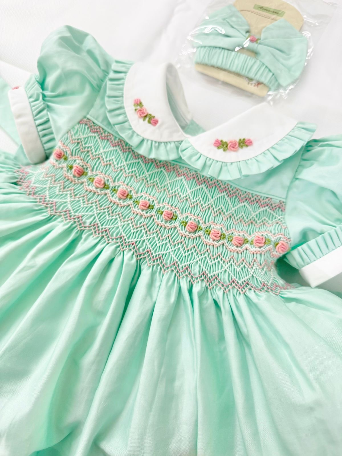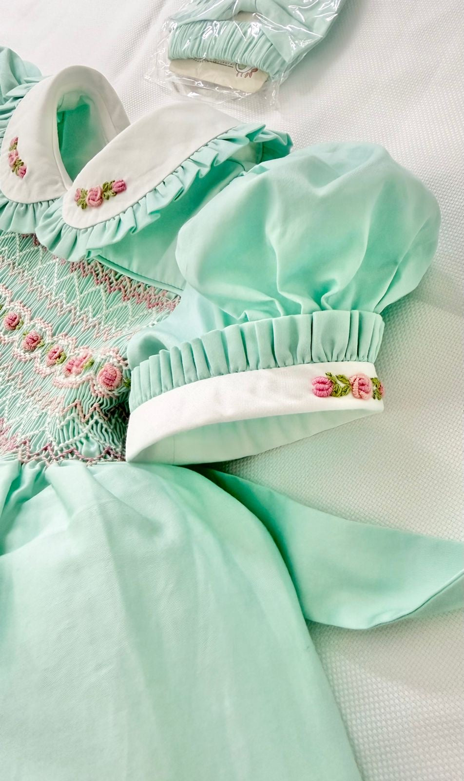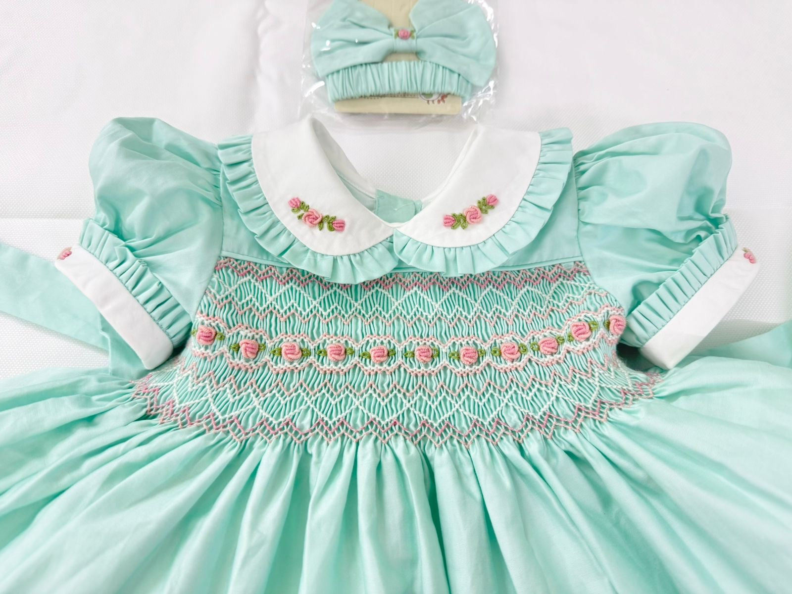 Hand smocked dress with pink smocking and embroidery. Comes with a full built in Petticoat.