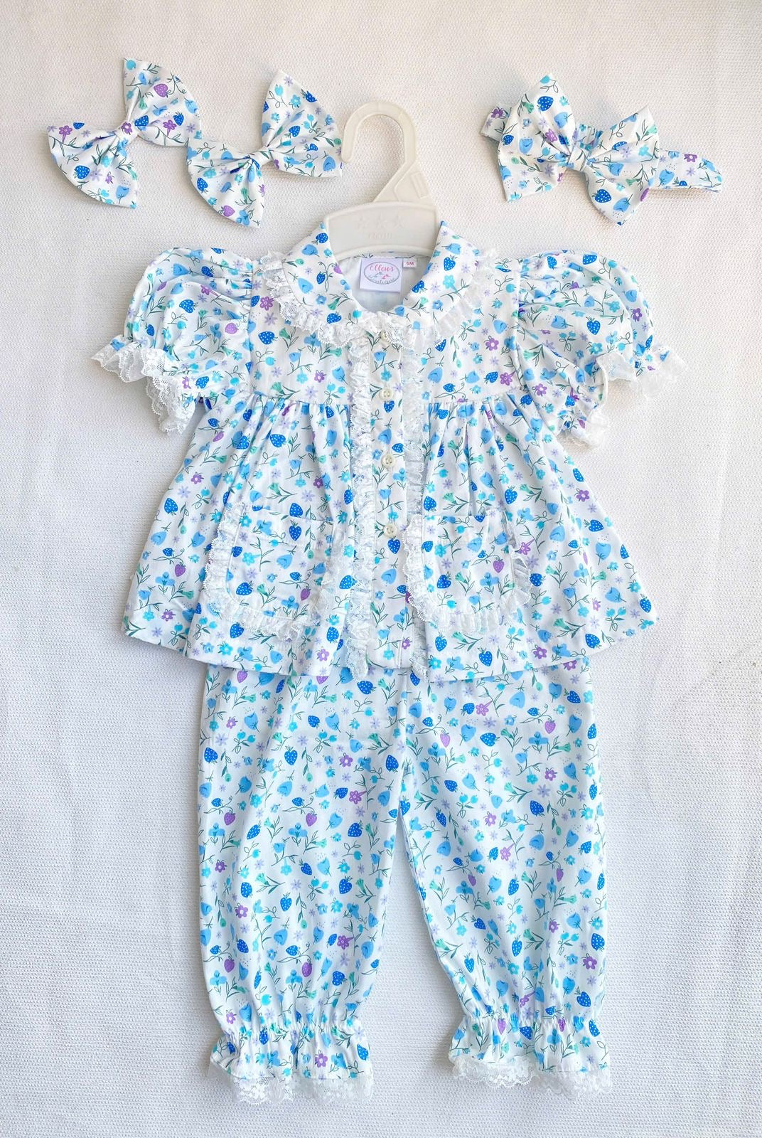 This comes with 2 matching hair clips (3m and 6m comes with headband). Fitting is slightly generous
