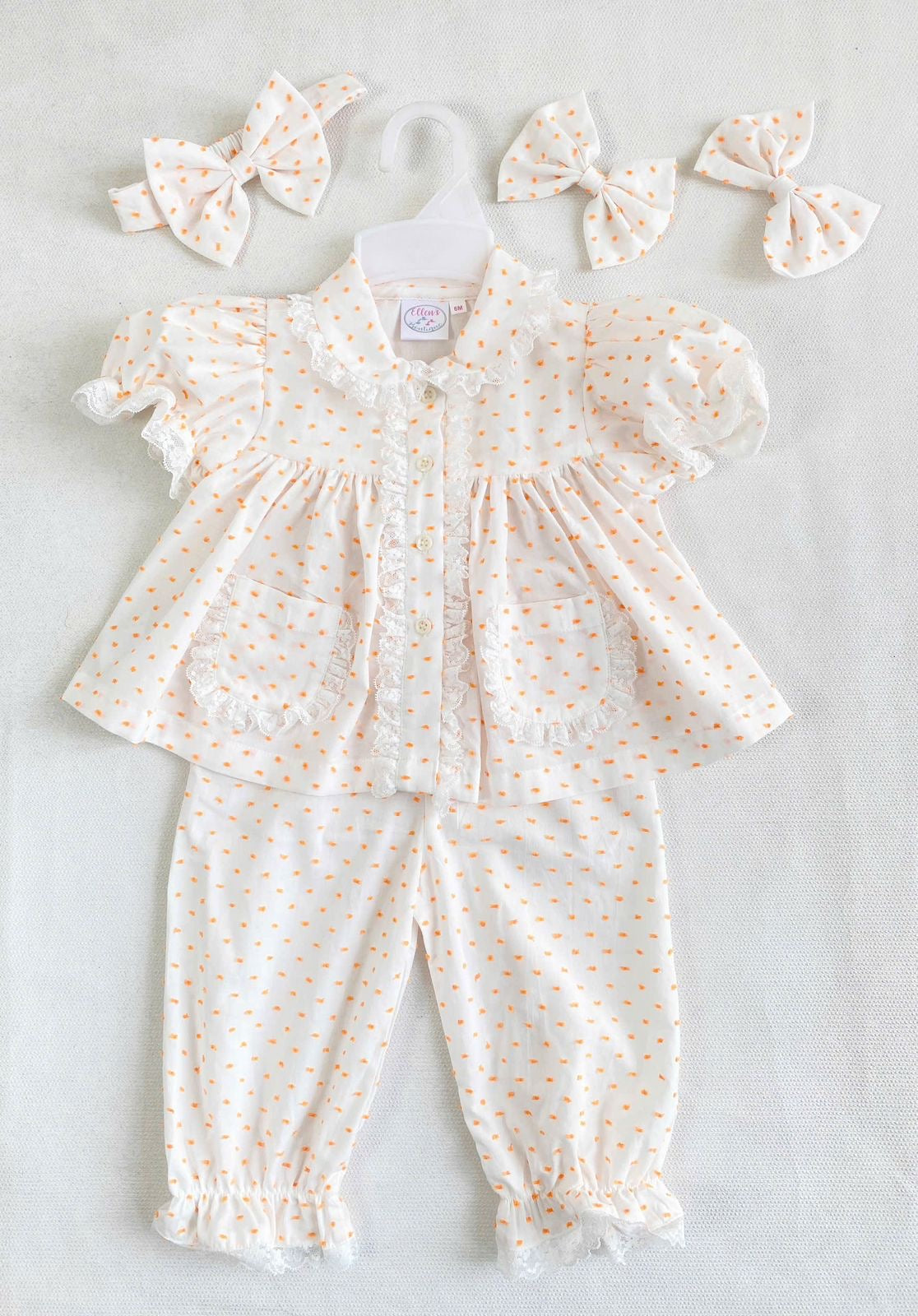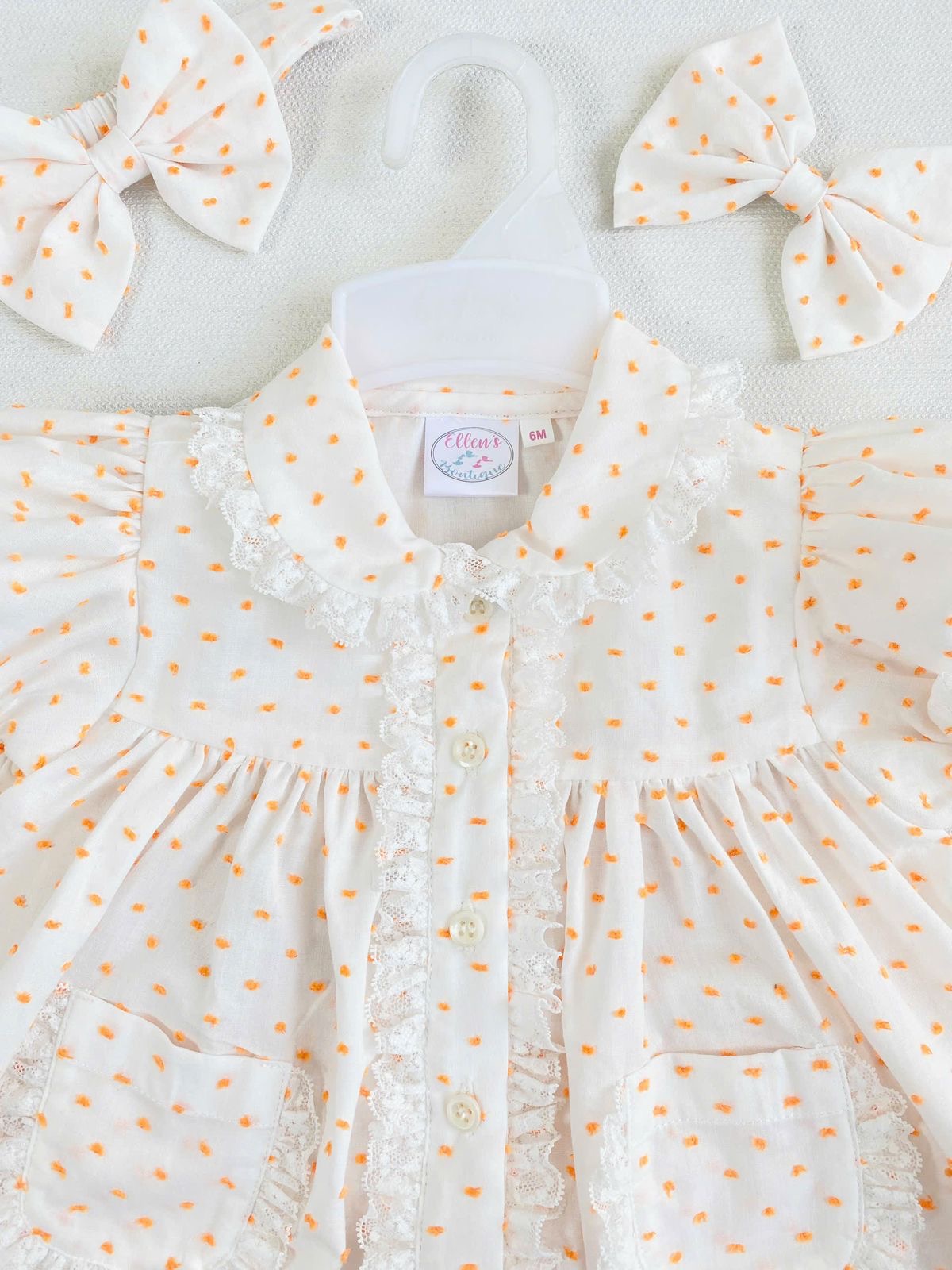 This comes with 2 matching hair clips (3m and 6m comes with headband). Fitting is slightly generous